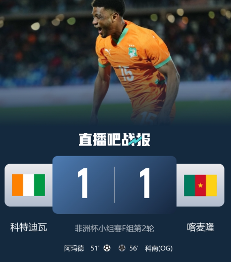 非洲杯焦点战:科特迪瓦1-1喀麦隆 阿玛德破门科南乌龙共造平局